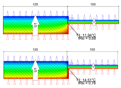 Wärmebrücken sind per Definition geometrisch oder materialbedingt, im weiteren Sinne, alles Störungen, die zu einem besonders abweichenden Wärmestrom führen. Im extremsten Fall kann es hier zu einer Taupunktunterschreitung kommen, die laut Norm bei 20°C Innentemperatur, -5°C Außentemperatur, 50% Luftfeuchtigkeit und 12,6° zur Kondenswasserbildung und evtl. Schimmelbildung führt. Bei höherer Luftfeuchtigkeit, z.B. durch viele Zimmerpflanzen, Aquarien, geringes Lüften kann die Luftfeuchtigkeit leicht auf 80% steigen. Die Tauwasserfreiheit wird über den fRSI-Wert errechnet, er muss über 0,7 liegen.